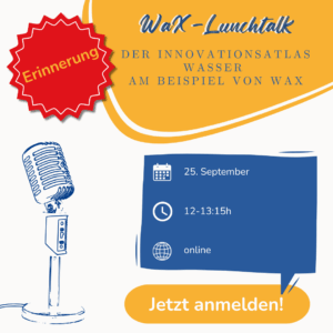 In vier Tagen, am Donnerstag, den 25. September findet der Lunchtalk „Der Innovationsatlas Wasser am Beispiel von WaX“ statt. Melden Sie sich jetzt noch an!