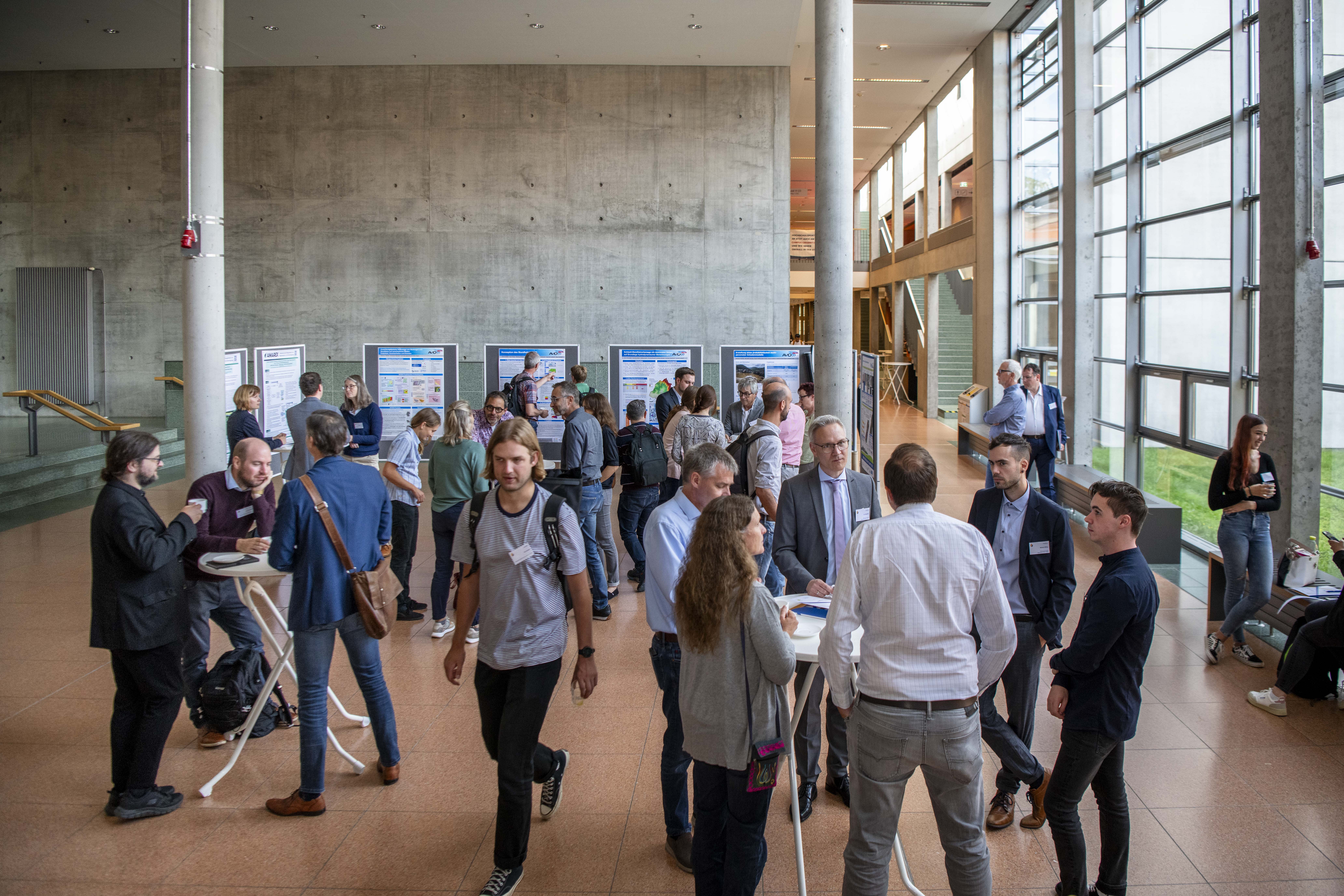 In den Pausen konnte ein individueller Austausch an den Postern stattfinden. Hier hatten die Mitarbeitenden die Gelegenheit ihre Arbeitspakete ausführlicher darzustellen. Während einer Poster-Führung konnten die Autor:innen weiterhin mit kurzen Pitches ihre Arbeit vorstellen, um vertiefte Diskussionen im Anschluss zu eröffnen. Am Mittwochnachmittag fanden zusätzlich vier parallele Workshops statt. Im Workshop zu Kommunikation und Partizipation in Forschungsprojekten wurde ein besonderer Fokus auf die Risikokommunikation von Wasserextremen und den damit einhergehenden Herausforderungen gelegt. Der Transfer von wissenschaftlichen Erkenntnissen in die Praxis wurde in einem zweiten Workshop thematisiert, darunter z.B. Herausforderungen bzgl. der Finanzierung und der Arbeitsintegration in der Praxis. Ein weiterer Workshop widmete sich der Wasserspeicherung in der Landschaft. Dabei wurden die verschiedenen Verfahren der Wasserspeicherung in den Verbünden vorgestellt und diskutiert, sei es oberirisch, oberflächennah oder in der Tiefe. Im vierten Workshop wurde das breite Spektrum methodischer Ansätze aus der Informatik thematisiert. Dabei wurde diskutiert, welche Chancen und Erwartungen der Einsatz von Künstlicher Intelligenz in der Hydrologie bietet und welche Herausforderungen und Grenzen dabei bestehen. Ausführlichere Berichte zu den vier Workshops finden Sie hier.